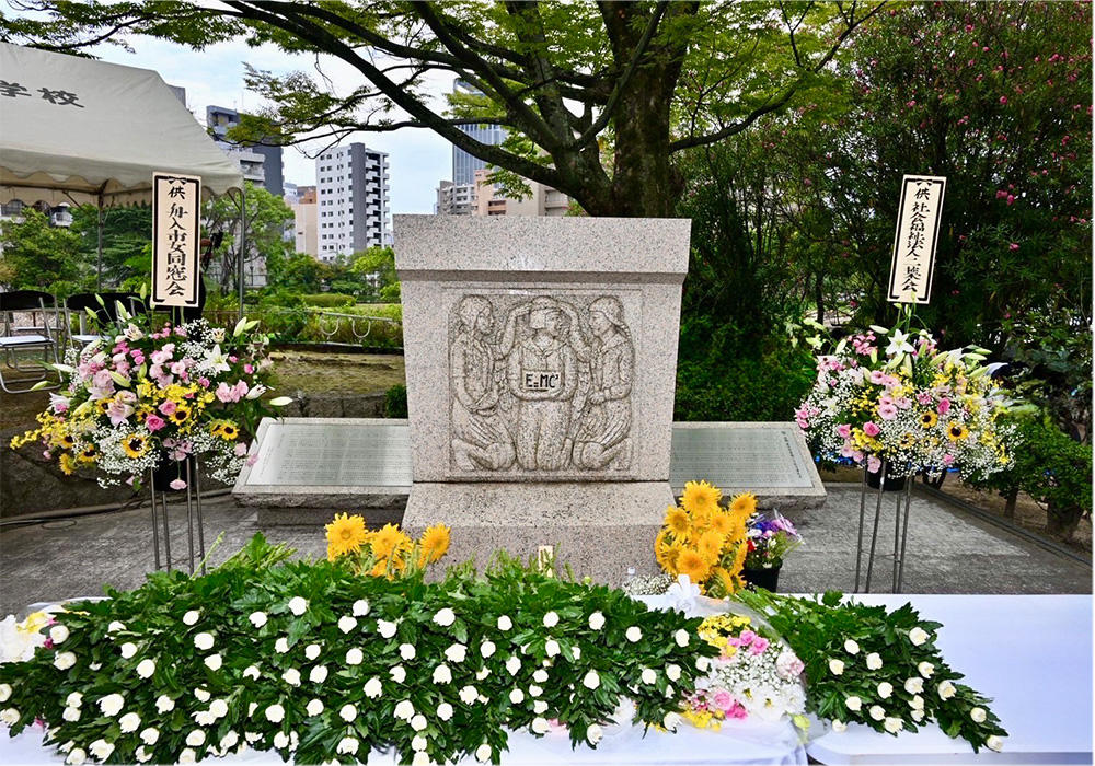 広島市中区の平和大橋西詰(元安川河岸)に建つ慰霊碑は、1948年8月6日に建立されました。1945年8月6日、爆心地から約500mの建物疎開作業現場にいた広島市立高等女学校の1・2年生541名と職員8名が全員亡くなり、他の動員先も含め676名が被爆死という市内の学校で最多の犠牲者数です。碑の裏面には当時の校長・宮川雅臣の短歌が刻まれ、中央の少女像が持つ箱にはアインシュタインの「E=MC²」の公式が記されています。これは連合軍占領下で「原爆」の文字が使用できなかった当時の事情を反映したものです。毎年8月6日には、この慰霊碑の前で原爆死没者慰霊式典が行われており、千田保育園も参加しています。